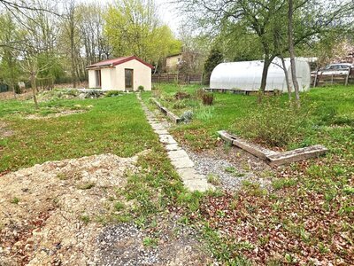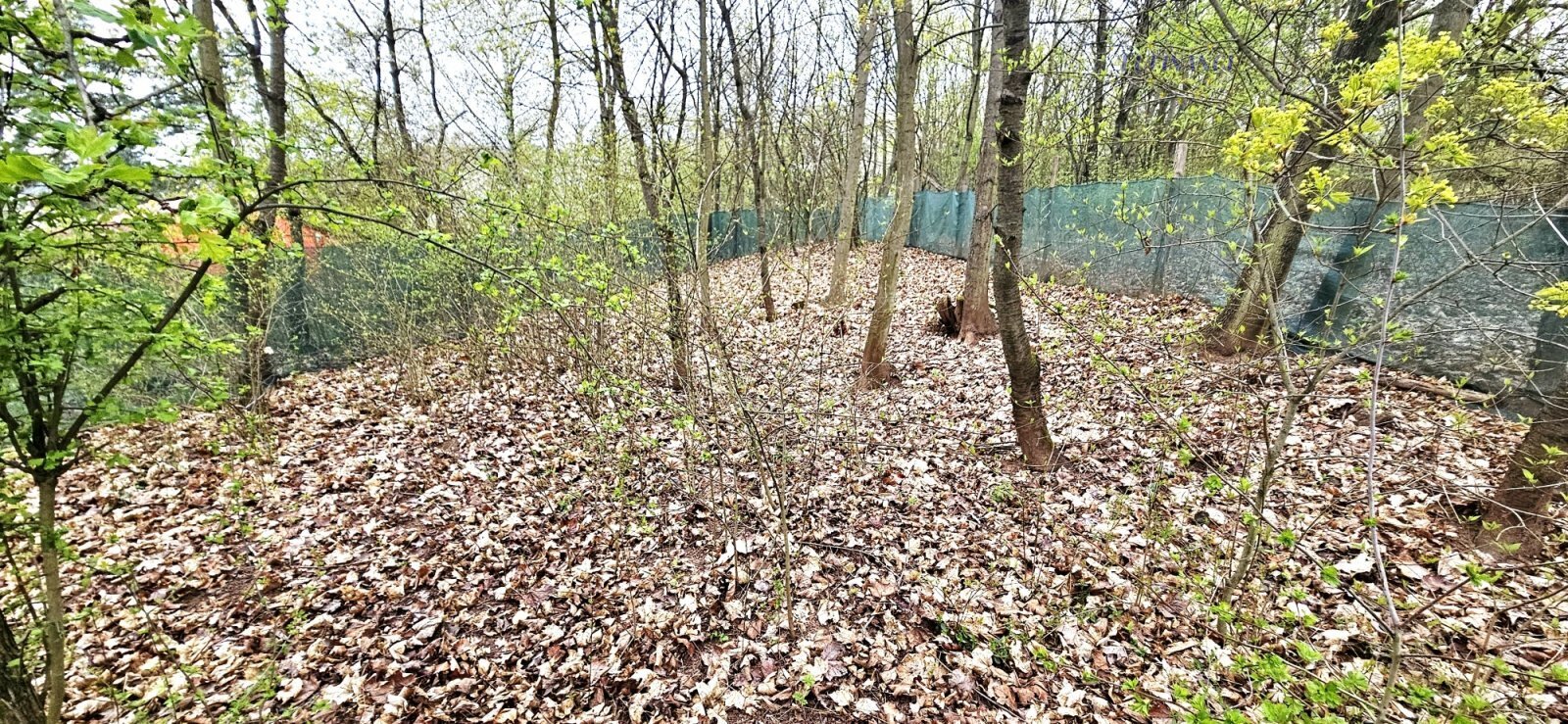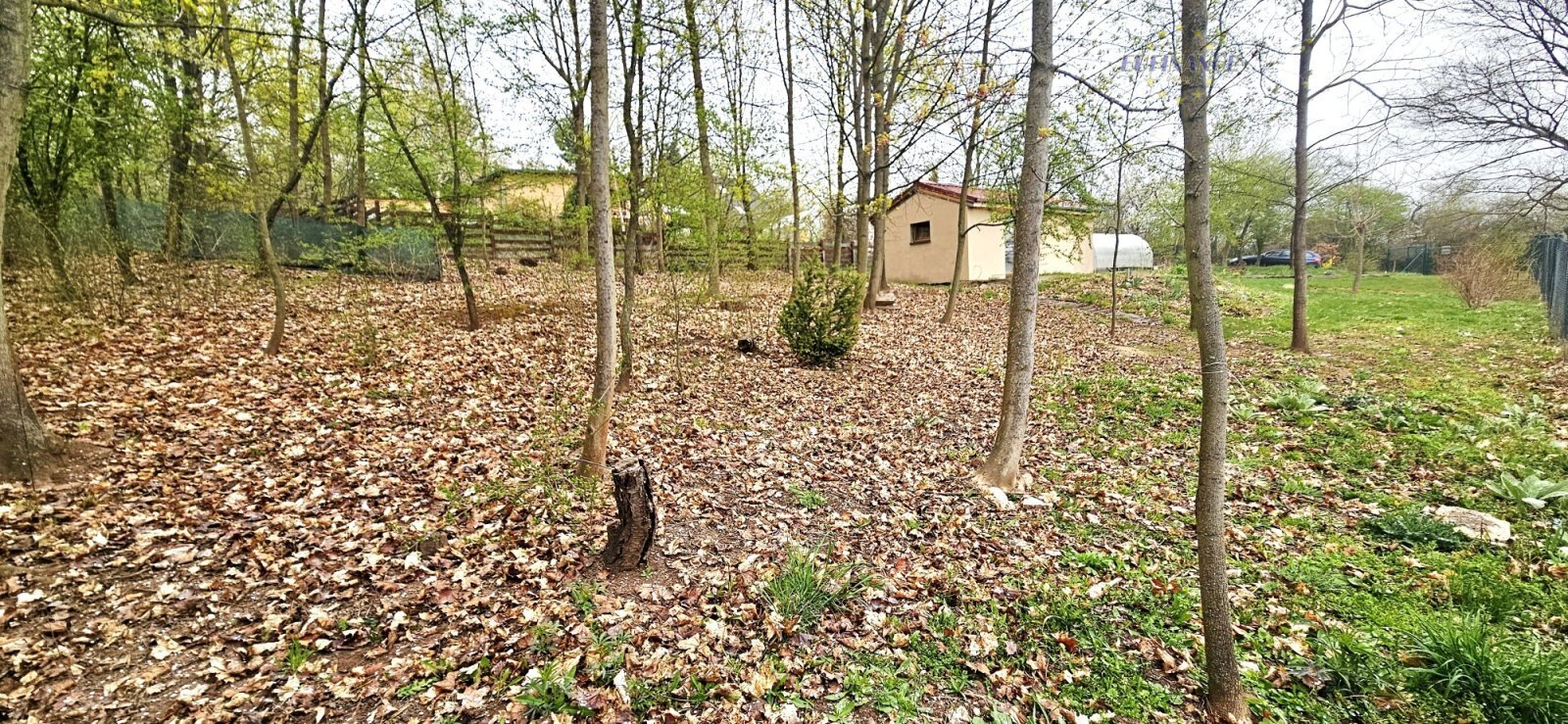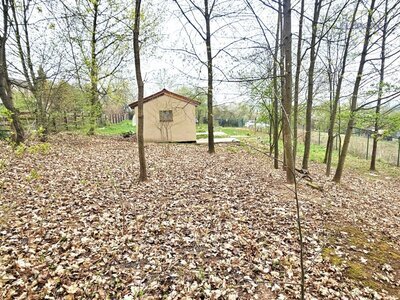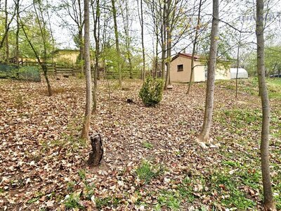 skleník a malý lesík vedle chaty. Pozemek je ze všech stran oplocen.
