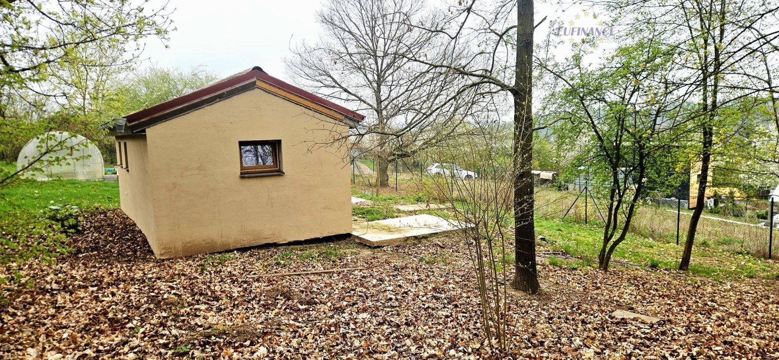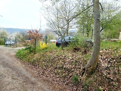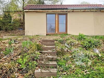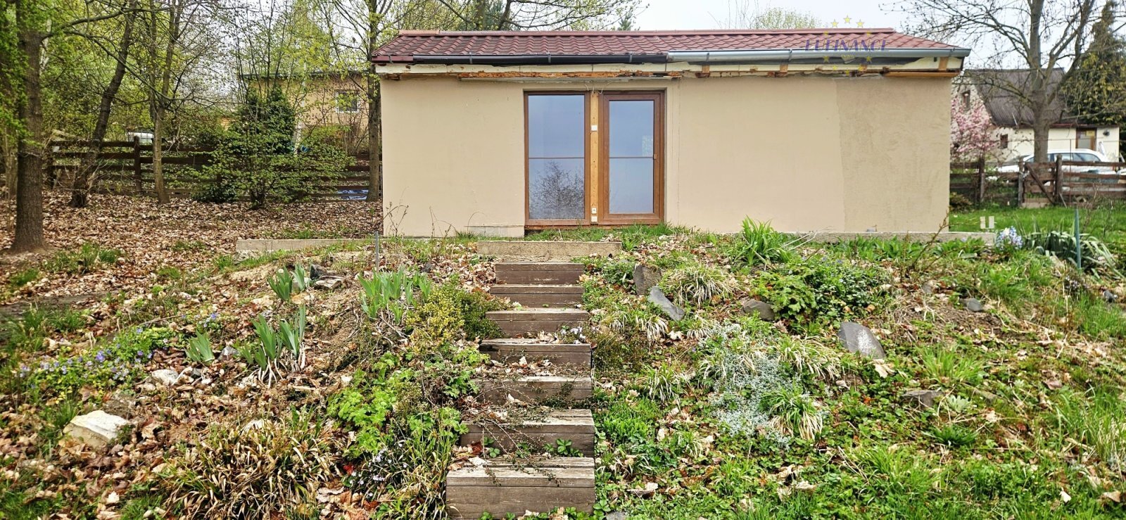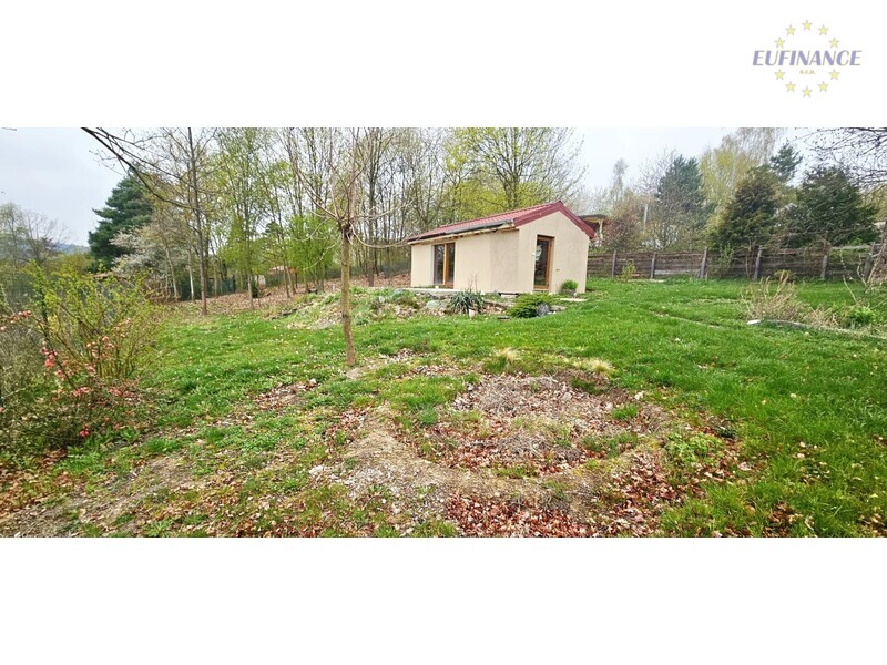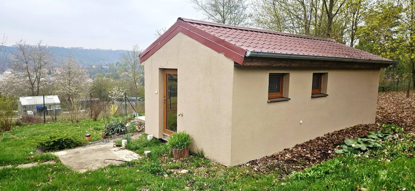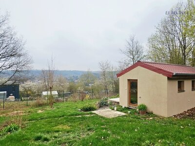 nádherným výhledem do krajiny. Součástí pozemku je zahradní chata, kterou